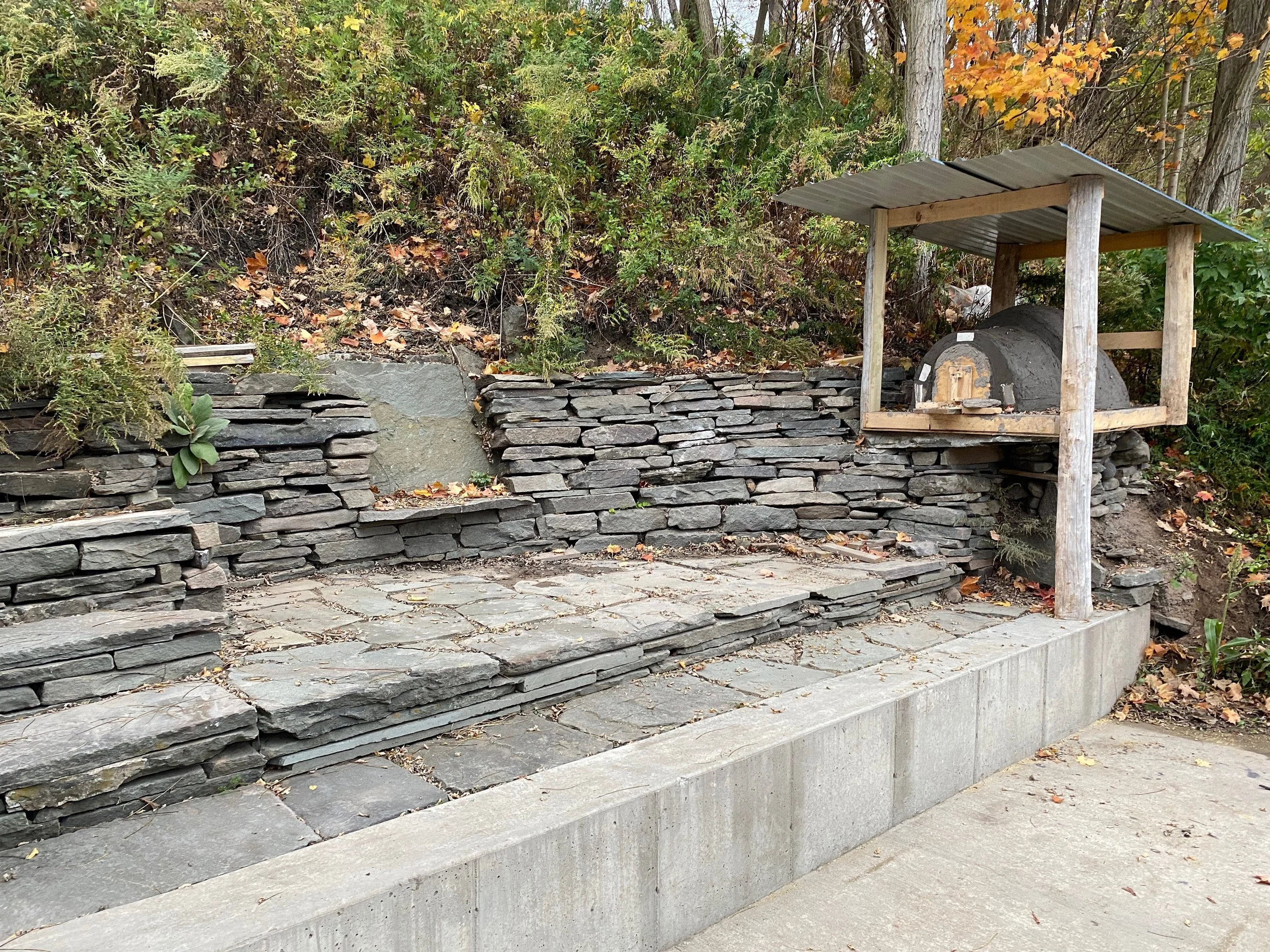There’s a public platform out front with a wood burning cob OVEN and a blue stone patio built by our neighbors.